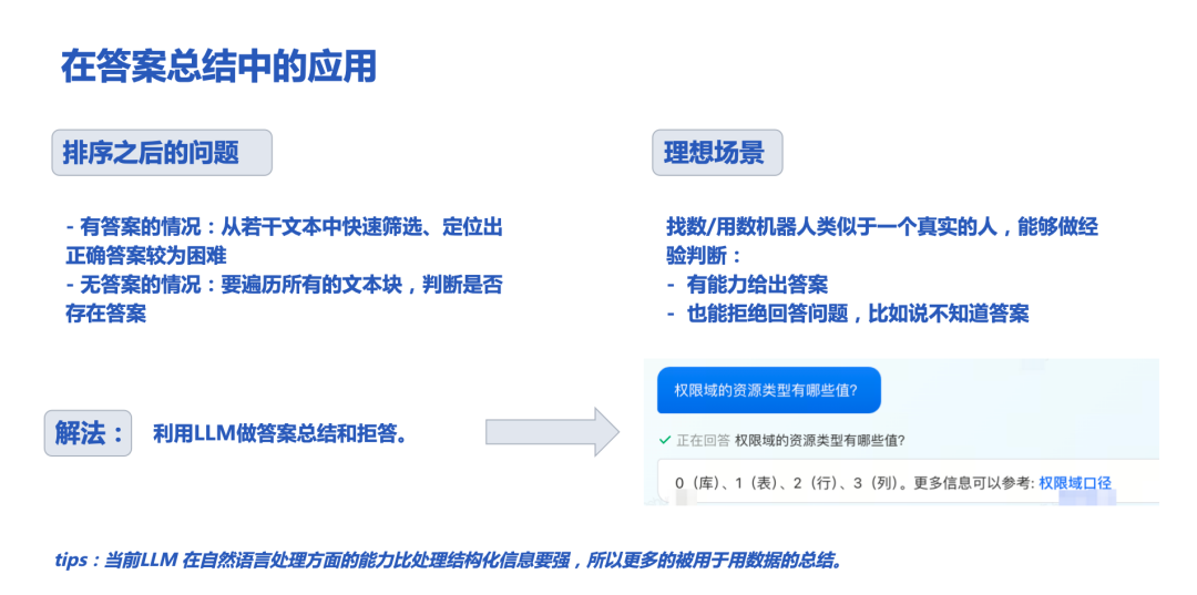 在排序之后,通常会进行一个总结环节。如果直接将排序后的结果(如TOP10的表或文档块)展示给用户,用户在有答案时可以找到所需内容,但如果没有答案,用户可能需要逐一查看这些内容,耗时费力,体验较差。因此,理想情况下,系统应能直接告知用户是否有答案。如果有,指出正确答案;如果没有,明确告知并建议联系数据开发团队或业务负责人。为解决这一问题,大模型被用于答案总结和拒答。具体而言,当用户询问权限域的资源类型时,大模型能够从相关文档中提取出关键信息,如0、1、2、3分别代表库、表、行、列,使用户无需翻阅整个文档即可获取所需信息。当前大模型在自然语言处理方面表现优于Hive表处理,因此在处理用户查询时更适合用于文档总结。