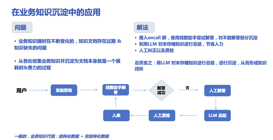 ● 业务知识是动态变化的,随着时间的推移和业务的发展,需要不断更新和优化,这对知识管理带来了挑战。● 人工解答用户咨询的问题后,需将这些解答内容收集并整理为文档,这一过程繁琐且耗时,增加了数据开发团队的负担。● 对于无法自动解答的用户咨询,仍需依赖人工解答,确保问题得到及时响应。● 人工解答后,大模型(LLM)会自动分析用户与数据开发人员的对话内容,将其提炼成FAQ,并自动存储到知识库中。● 由于自动生成的FAQ可能存在偏差,因此需要进行人工校对和修正,确保内容准确无误。通过这种方式,大模型能够对未存储的数据进行沉淀和总结,逐步完善知识库,实现知识管理的机制闭环,并保持业务知识的动态更新与优化。