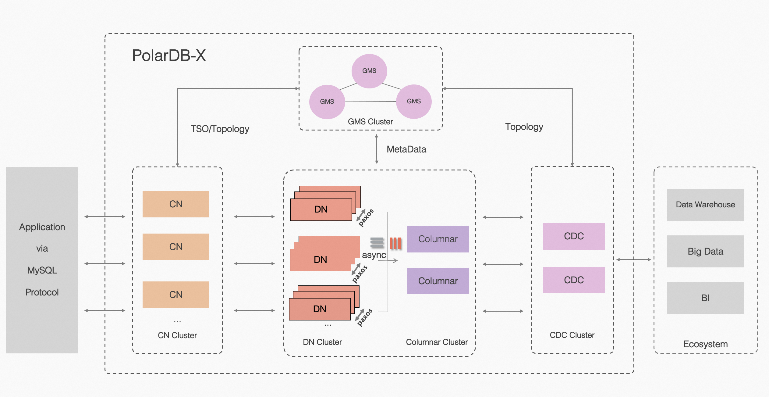 PolarDB-X 采用 Shared-nothing 与存储分离计算架构进行设计,系统由5个核心组件组成。