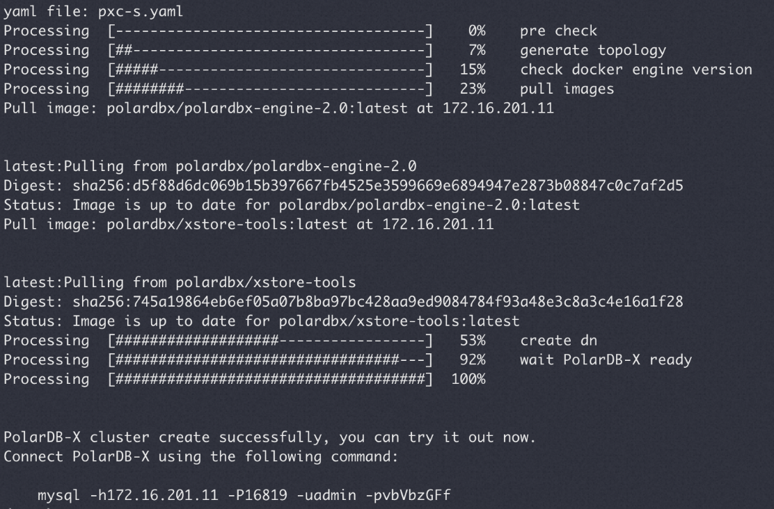 现在我们来快速部署一个 PolarDB-X 标准版集群,它仅包含 1 个由三副本组成的DN节点。执行以下命令创建一个这样的标准版集群: