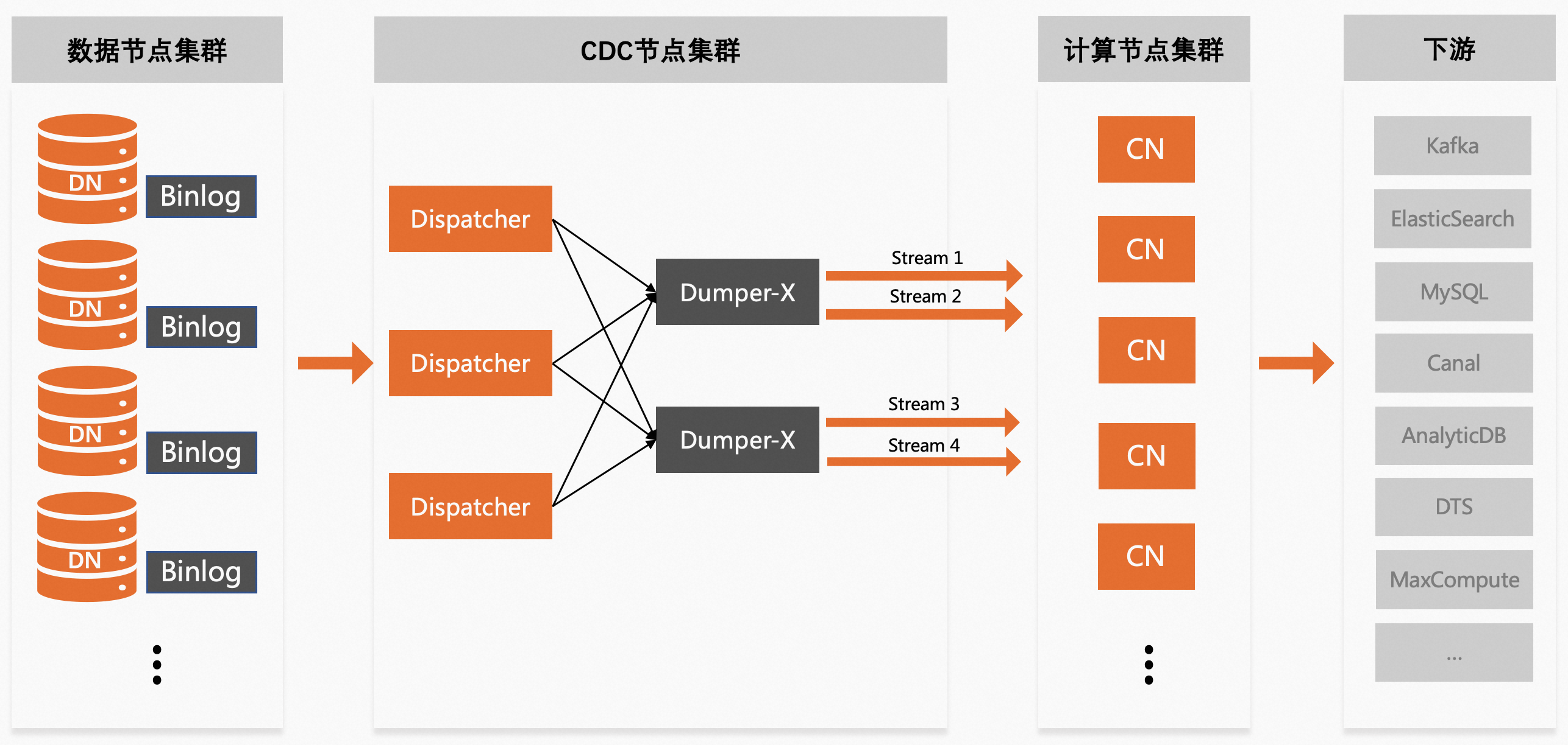 - 多流形态:即多流binlog日志(也称为Binlog-X),并不是将所有DN的binlog归并到一个全局队列,而是将数据进行Hash打散并分发到不同的日志流,在一定程度上牺牲了事务的完整性,但大大提升了扩展性,可以解决大规模集群下单流binlog存在的单点瓶颈问题。