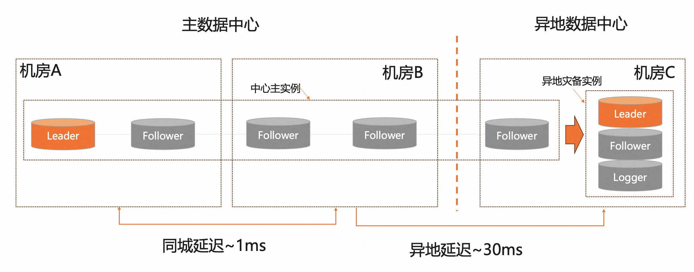 - 异地灾备实例,推荐选择为一个独立的Paxos 3副本实例,结合PolarDB-X的Logger副本类型,最后等价于2副本模式