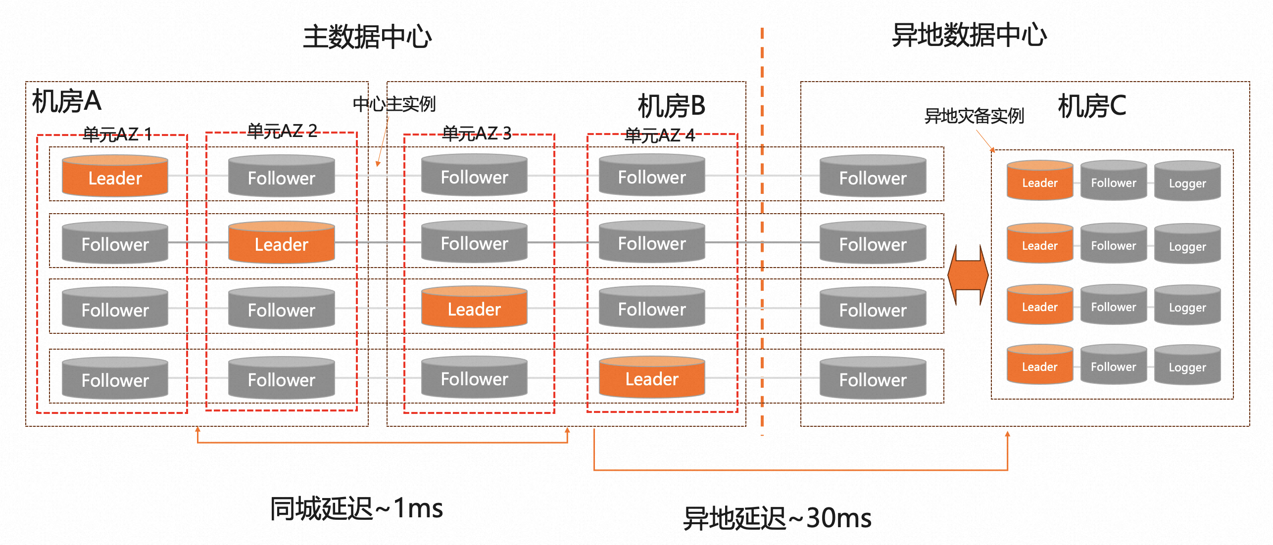 - 中心主实例,异地副本不能选为Leader,否则单元会有跨地域访问的场景,导致RT异常。