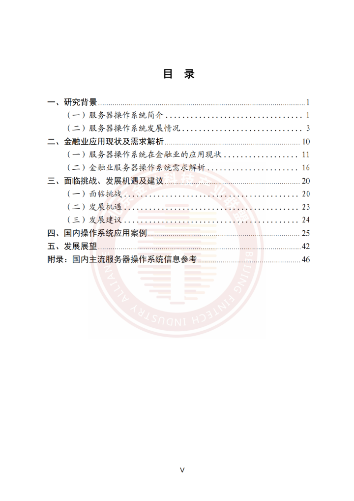 报告第一章回顾了服务器操作系统的发展情况,给出了国内服务器操作系统的总览和索引;第二章对国内服务器市场占比进行了调研,对行业需求进行了分析,客观呈现了国内服务器操作系统在典型金融应用场景下的应用效果;第三章阐述了现阶段国内服务器操作系统在金融行业应用中遇到的问题及挑战,分析了发展机遇,给出了有针对性的解决方案和建议;第四章展示了相关服务器操作系统在金融行业的实际应用案例,分析了项目带来的成效;第五章结合当下金融科技新动向,对国内服务器操作系统的未来趋势给出了研判。