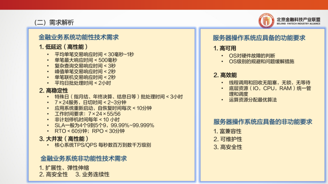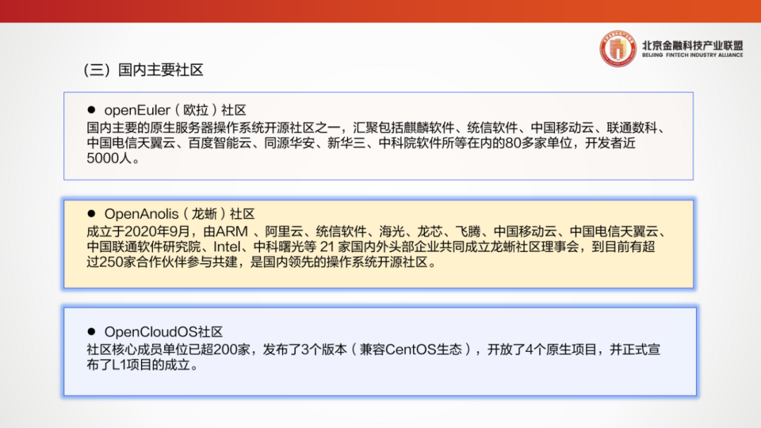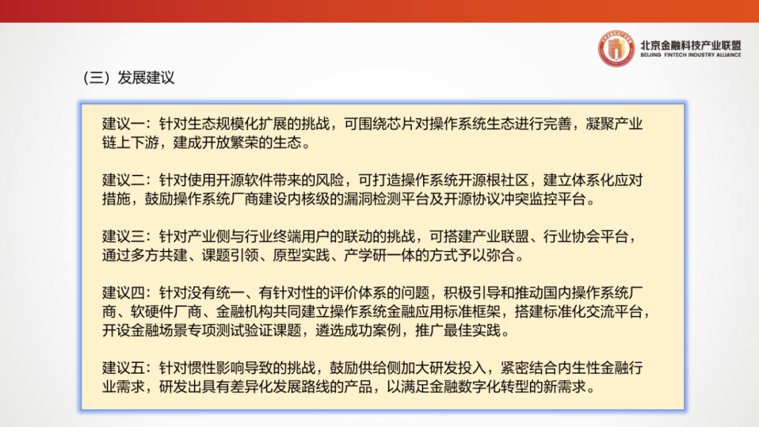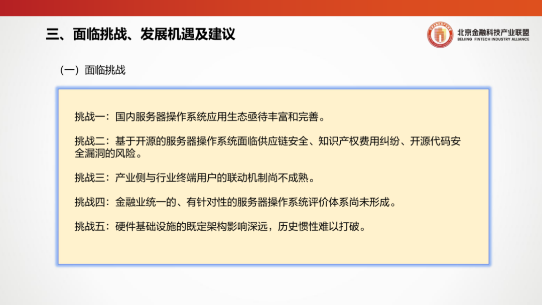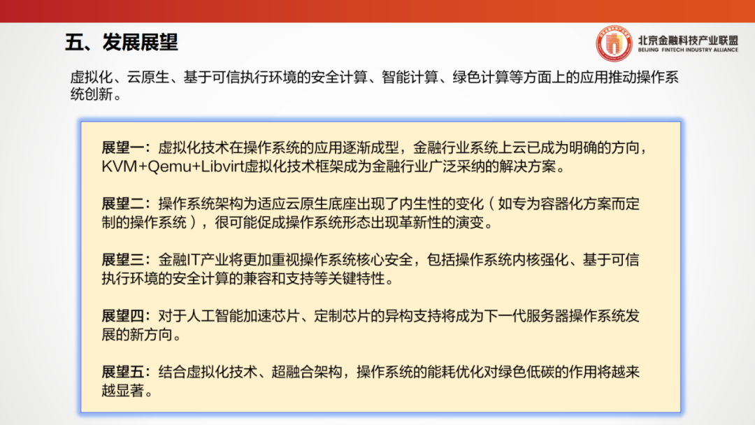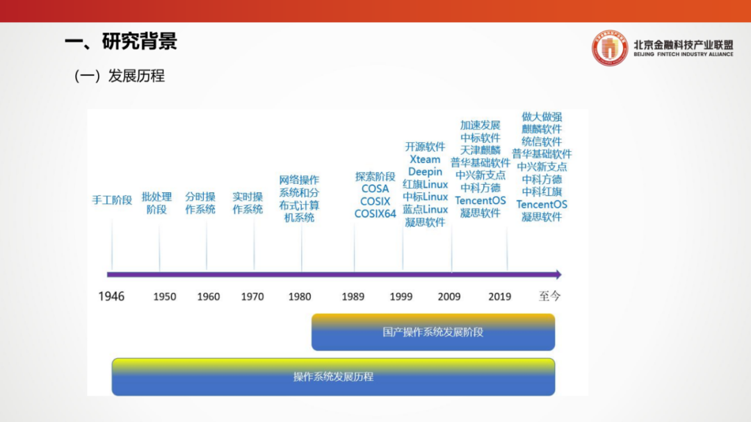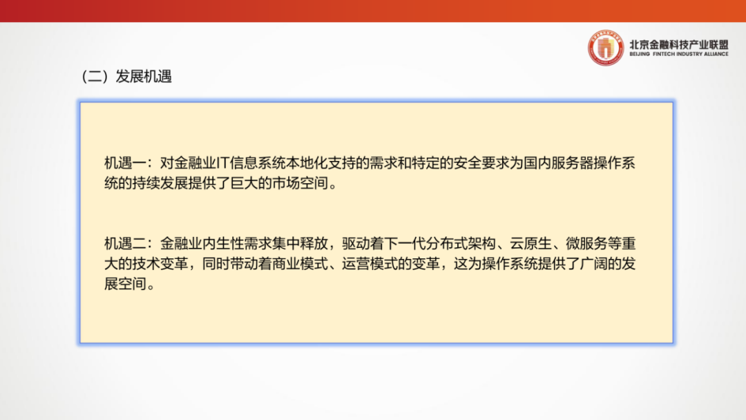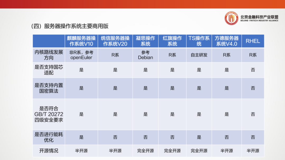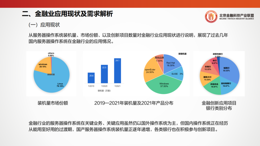 国内服务器操作系统已在金融领域规模化应用,正处于从非核心系统过渡到核心系统的过程中,在安全性方面更加契合金融管理要求。为研究如何充分结合当下金融科技发展形势、推动打造良好的操作系统生态、给出金融行业维度的思考和前瞻性建议,北京金融科技产业联盟组织开展了服务器操作系统金融应用研究,由北京国金认证、建设银行牵头,联合华为、统信软件、麒麟软件等机构共同编制《金融业服务器操作系统发展研究报告》。