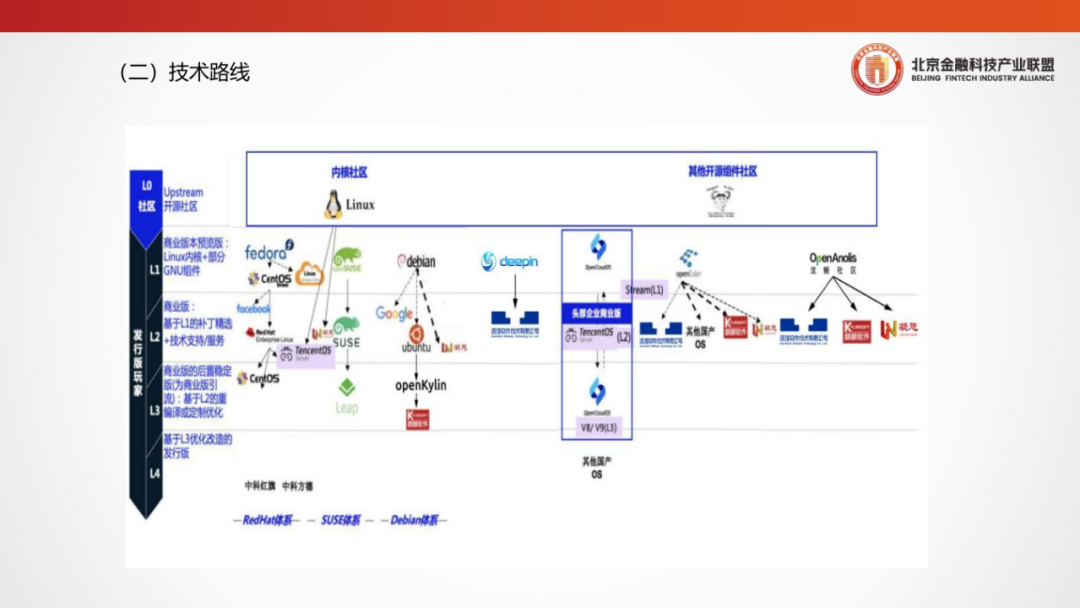 国内主流厂商包括麒麟软件、统信软件、凝思软件、红旗软件等,BAT(B:百度;A:阿里巴巴;T:腾讯)也分别推出自己的操作系统。目前来看,Red Hat路线逐渐在国内占据了发展趋势的主流,尤其是服务器操作系统方向,少数国内厂商也正在尝试建立自己的L1根社区。Linux社区及版本的关系图谱见图2。