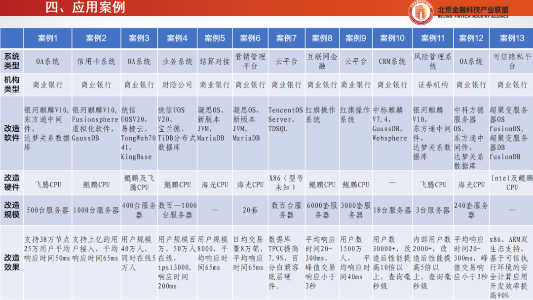 本章选取了近年来金融业13个典型案例,国内操作系统在金融应用中也正在初步从外围系统向核心系统深入,支持的业务系统也从实时性不强、并发量要求不高逐步过渡到低延时、大并发场景。图10展示了本文案例的概要情况。