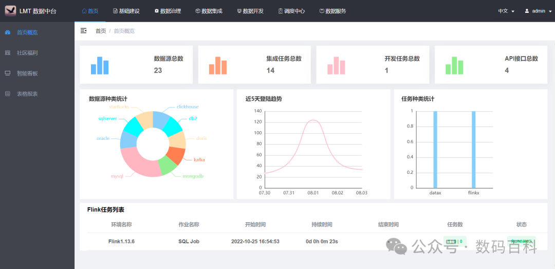 LarkMidTable 是一站式开源的数据中台,实现中台的基础建设,数据治理,数据开发,监控告警,数据服务,数据的可视化,实现高效赋能数据前台并提供数据服务的产品。