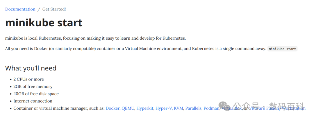 大概意思是说,需要准备一台不能小于 2核心、2G内存、20G磁盘、能连接互联网的主机,而且主机需要有容器或者虚拟机环境,比如:docker、虚拟化软件其中之一,然后安装 minikube 就一条命令的事情:
