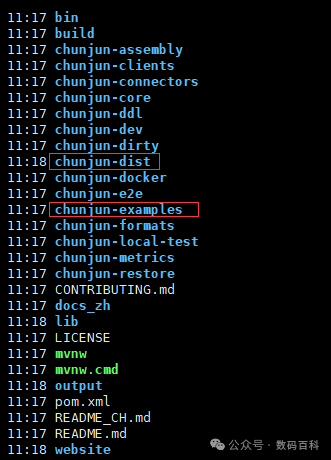 在根目录下生成 chunjun-dist目录,官方提供丰富的示例程序,详细可以查看chunjun-examples目录