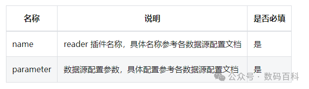 reader 用于配置数据的输入源,即数据从何而来。具体配置如下所示: