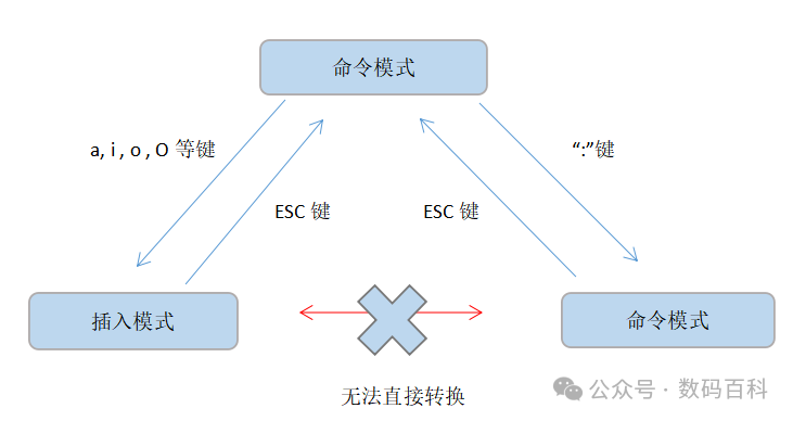 4、三种模式之间的切换:注意:三种模式之间不是任意切换的,只有在命令模式下才可以进入插入模式和末行模式。