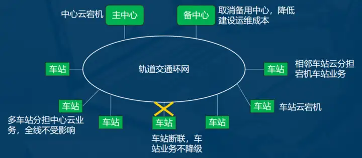 此外,为避免车站业务不可用情况,城轨系统更倾向于部署在中心云与边缘云结合的分布式云,每个车站为一个小的边缘云,所有的车站在线路、线网层面再组成一个大的分布式云,并共享、调配系统资源。