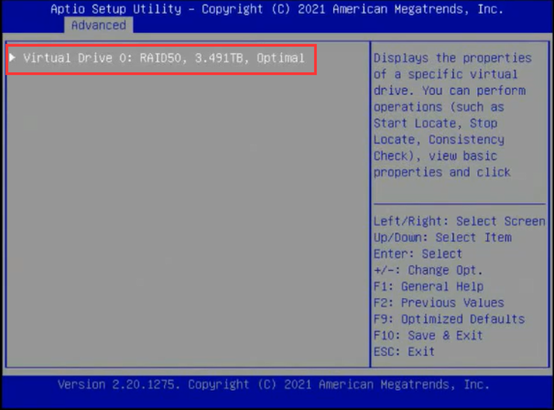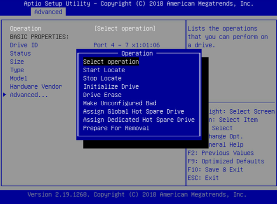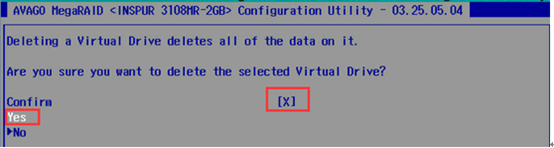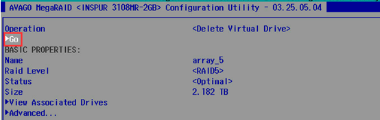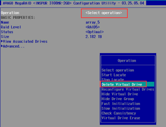 选择要删除的阵列,在Operation中选择Delete Virtual Drive。