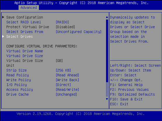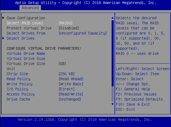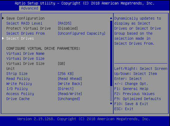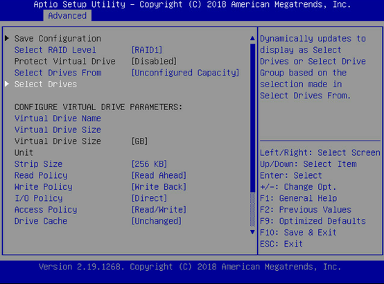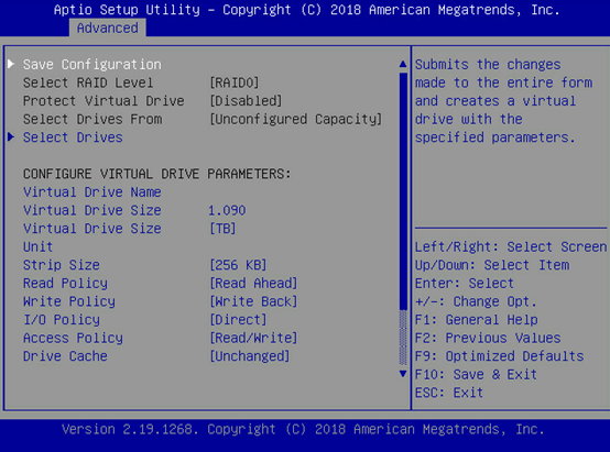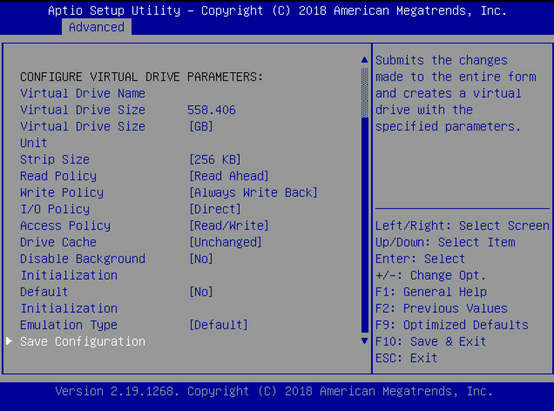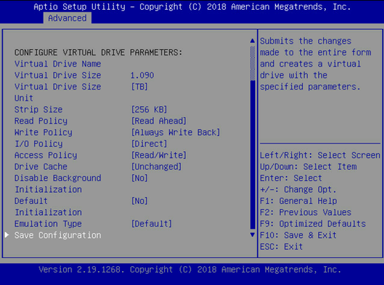 Virtual Drive Name:逻辑卷的名称 Virtual Drive Size:设置逻辑卷大小,默认为可设置的最大值