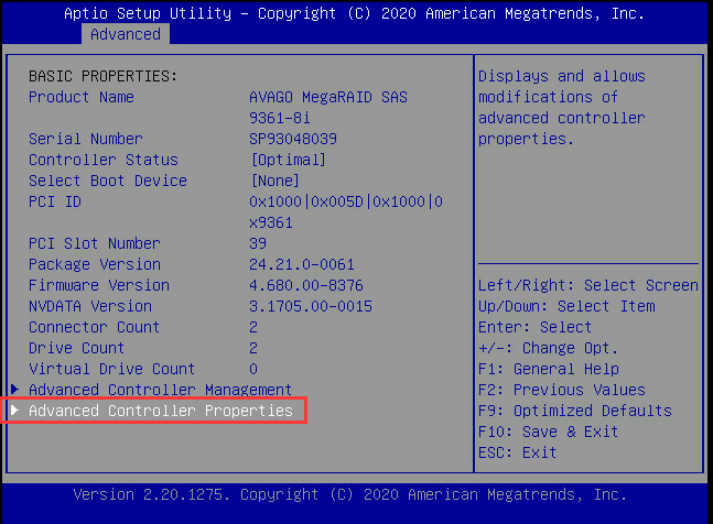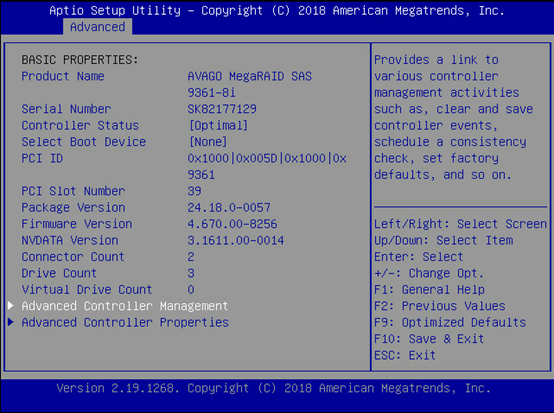 Product Name :RAID卡名称 Controller Status :RAID卡当前状态(Optimal为正常状态) Select Boot Device:设置哪个虚拟卷为开机启动项/设置哪个虚拟卷为系统盘 Firmware Version:固件版本 选择”Advanced Controller Management”进入如下页面: