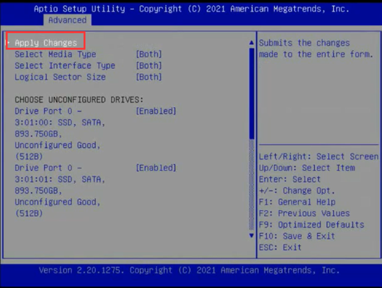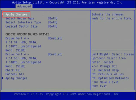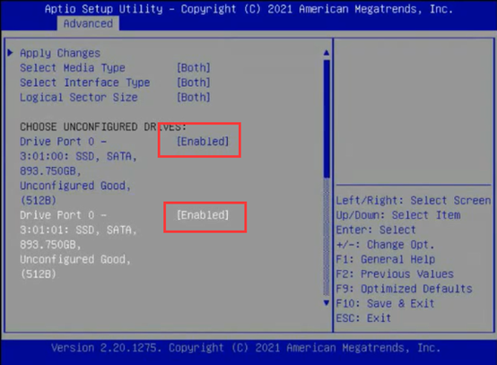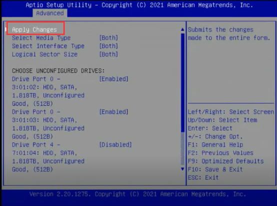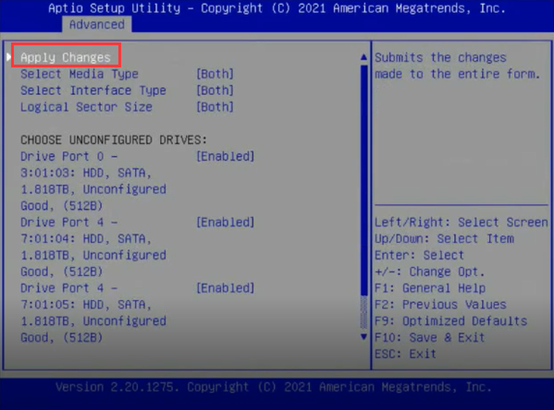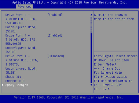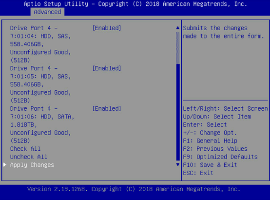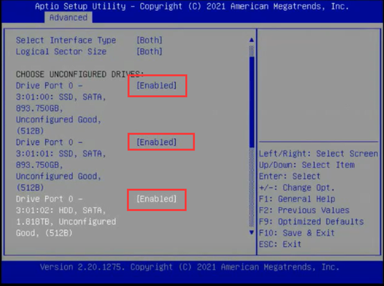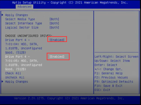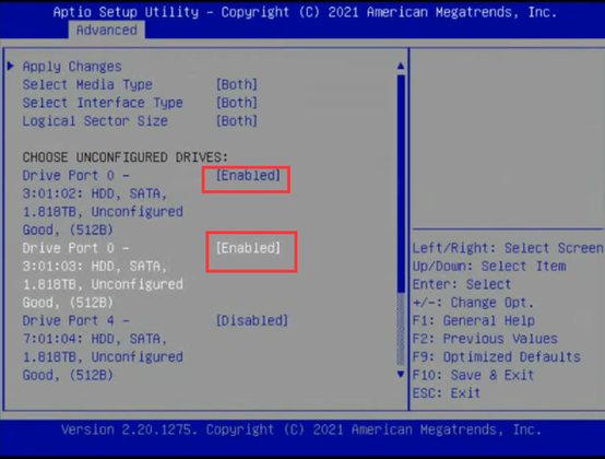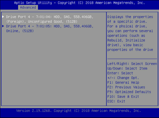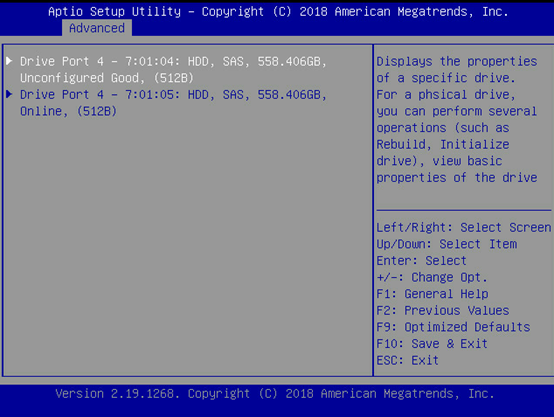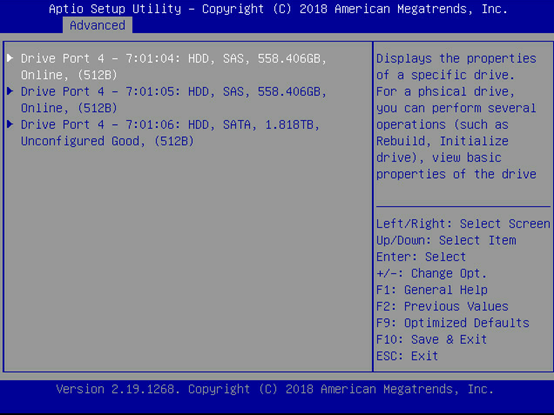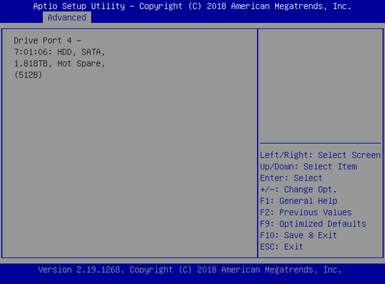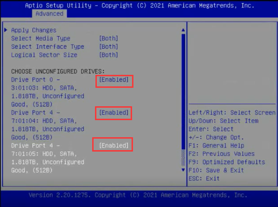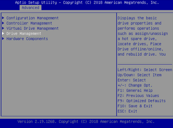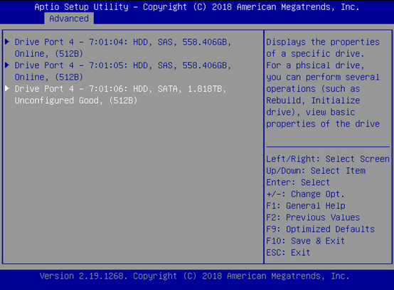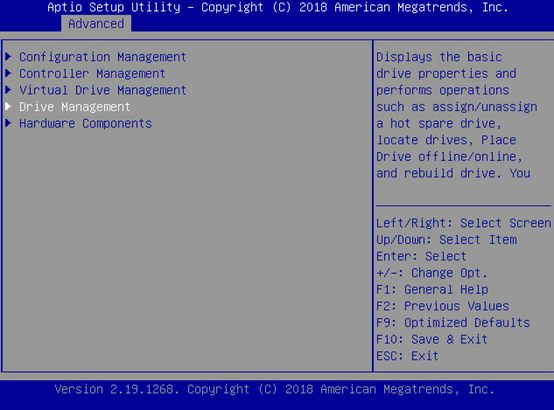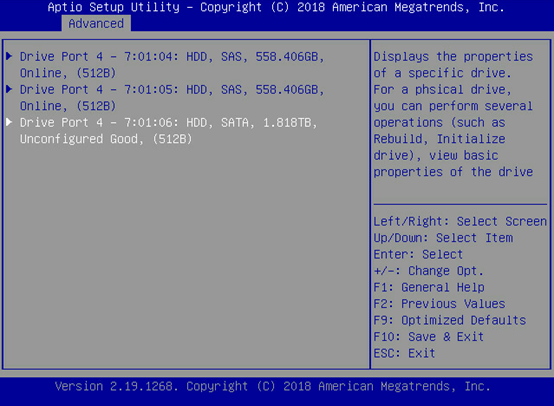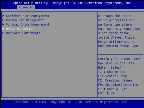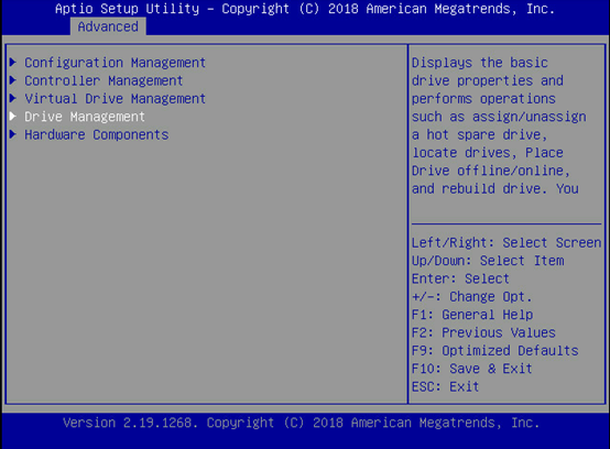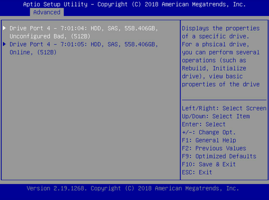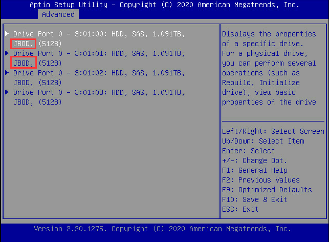 JBOD功能模式启用后,进物理磁盘查看硬盘状态: Main Menu-Drive Management