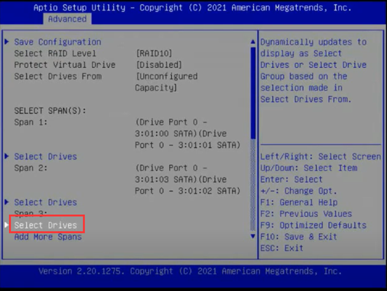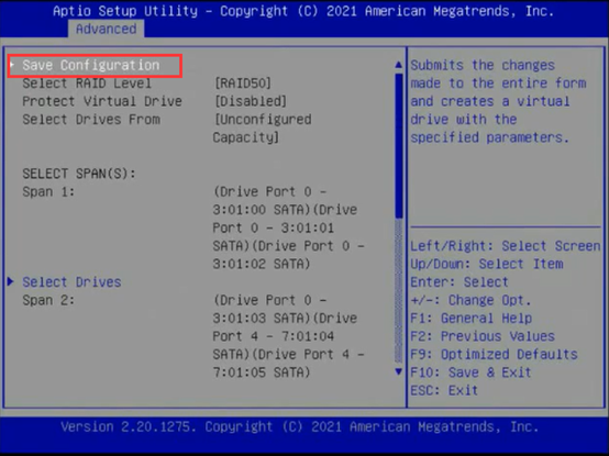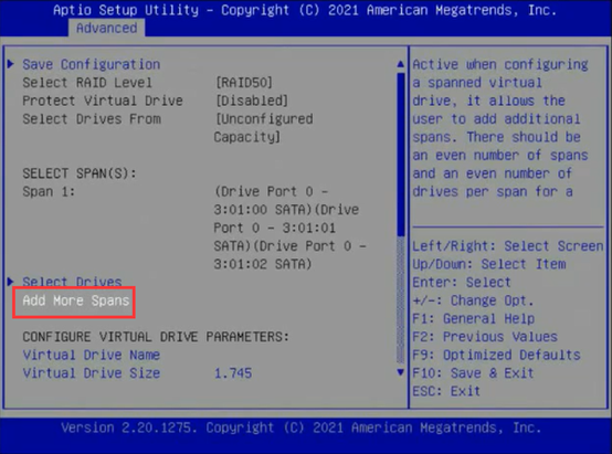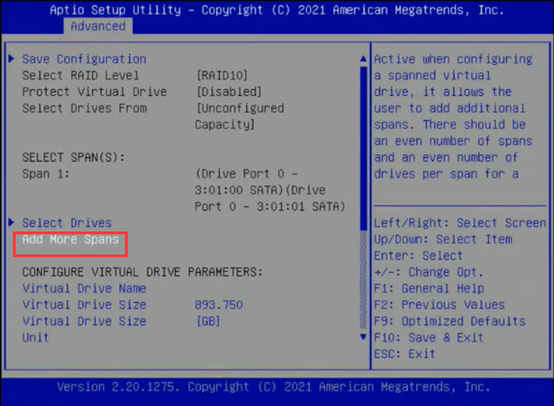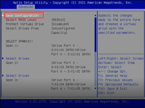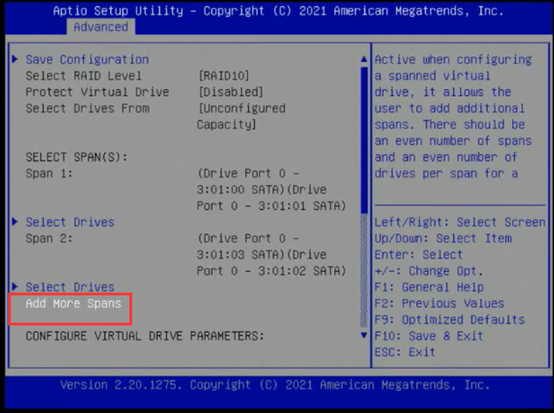 如果是4块盘配置Raid10,此处可以选择Save configuration保存配置。 此处以6块磁盘配置Raid10为例,选择Add More Spans添加更多的span: