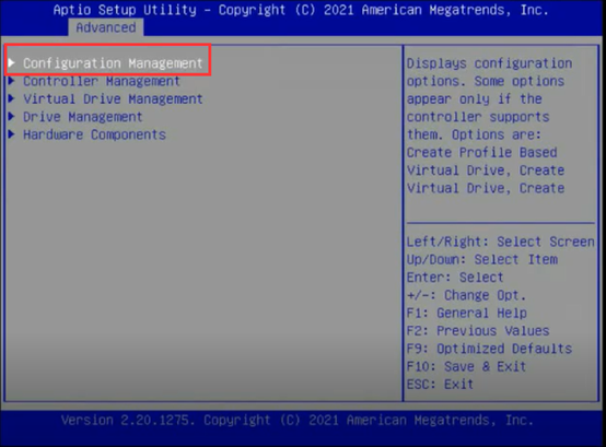 Raid10需要至少4块盘,此处以6块盘配置raid10为例: 进入”Configuration Management”页面,选择”Create Virtual Drive”,如下图: