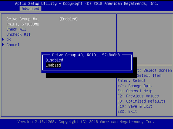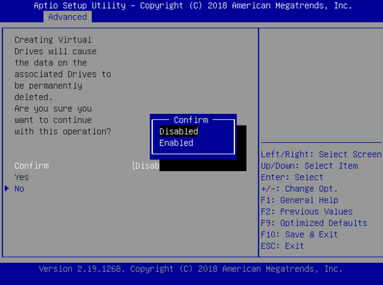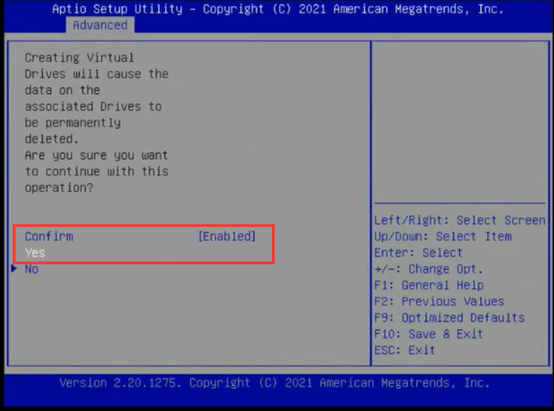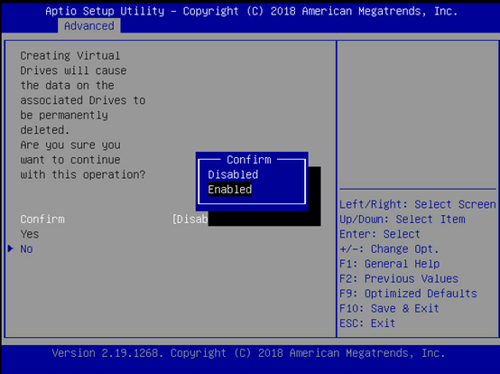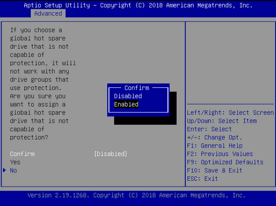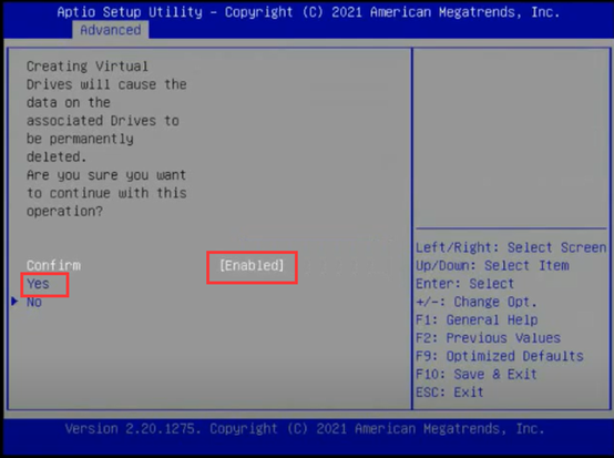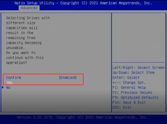 当配置Raid50所用磁盘容量不同时会出现如下提示,如果出现,选择Enabled 后选yes,如果没有此提示,忽略此步骤即可:
