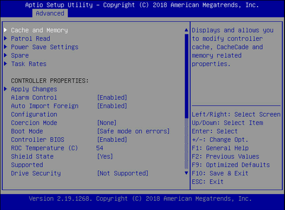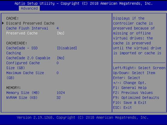 Alarm Control:设置RAID卡的蜂鸣器disable(失效)、enable(生效)以及silence(本次失效,消除本次报警) Boot Mode:Stop on errors自检出现错误停止/Pause on errors 自检出现错误暂停/Ignore on errors 自检出现错误忽略/Safe mode on errors 自检出现错误进入安全模式 ROC Temperature(C):RAID卡的ROC芯片温度 在”Advanced Controller Properties”-“Cache and Memory”中查看RAID卡的缓存大小和NVRAM的大小,如下图: