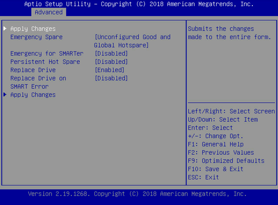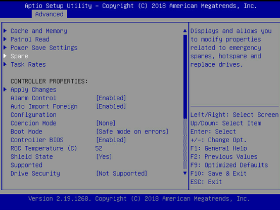 Memory Size(MB):RAID卡缓存的大小 NVRAM Size(KB):用于记录RAID卡RAID信息 在”Advanced Controller Properties”-“Spare”页面,设置Emergency Spare紧急热备的配置,设置为”Unconfigured Good and Global Hotspare”时逻辑卷中有硬盘故障的时候,UG状态的磁盘和GHS状态的磁盘会自动进行Rebuild操作。