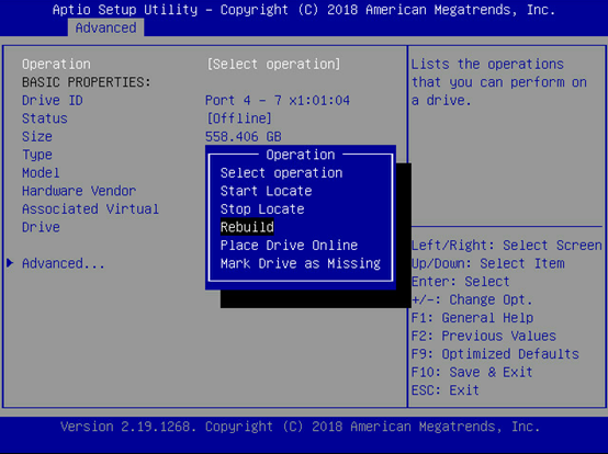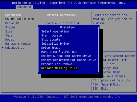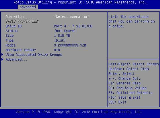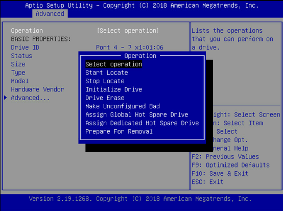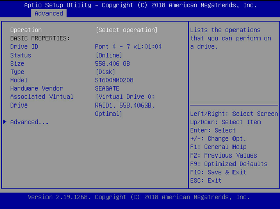 Foreign:包含已配置RADI信息的磁盘 选在需要操作的硬盘,按回车键进入到操作界面,在”Operation”按回车,如下图: