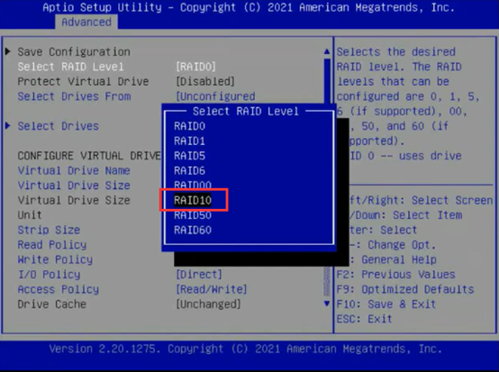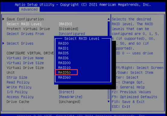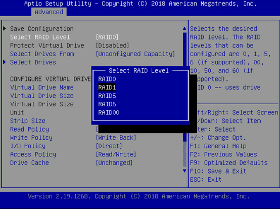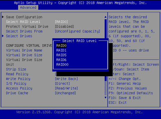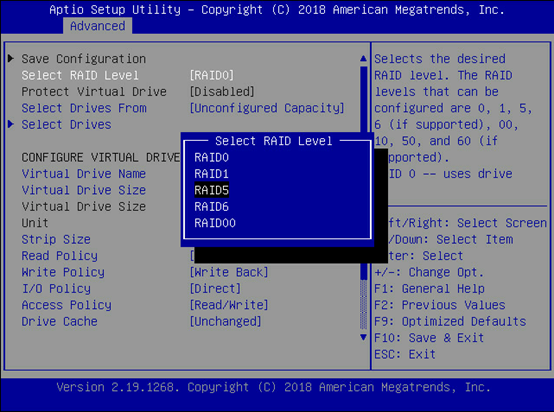 RAID配置页面中 Select RAID Level:RAID5 Select Drives From:新建RAID逻辑卷需要选择”Unconfigured Capacity”