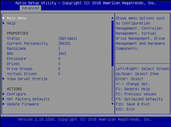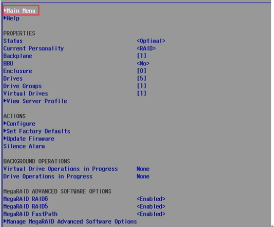 在开始界面中需要关注的参数 BBU(Battery BackUp):RAID卡是否含有电池 Set Factory Defaults:设置恢复出厂设置 Silence Alarm :取消RAID卡本次报警声音 选”Main Menu”进入主界面菜单,如下图: