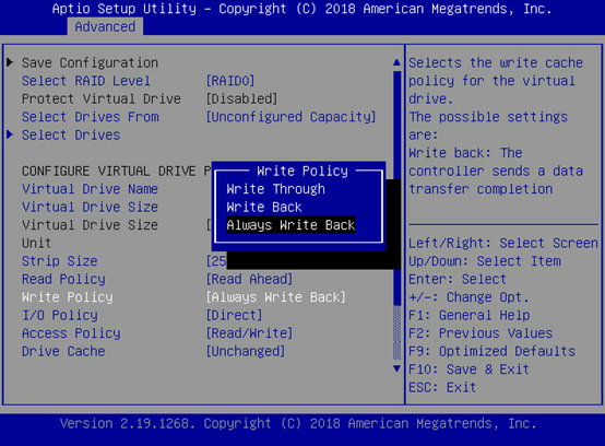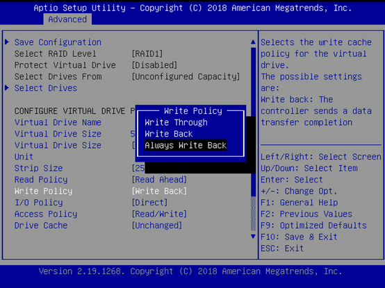 Write Policy写策略设置,Write Through:不开启Cache功能,数据写入不通过RAID卡缓存,直接写入到硬盘,写入性能比较低;