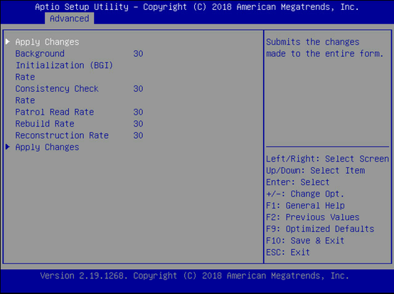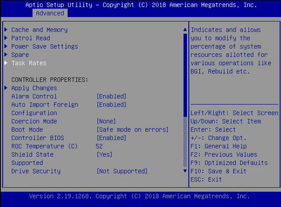 BGI Rate(Background Initialization Rate):后台初始化进程占用RAID卡IOP芯片的性能最大百分比 CC Rate(Consistency Check Rate):数据一致性校验进程占用RAID卡IOP芯片的性能最大百分比 Rebuild Rate:后台Rebuild进程占用RAID卡IOP芯片的性能最大的百分比 Recon. Rate(Reconstruction Rate):强制上线重新构建RAID信息进程占用RAID卡IOP芯片的性能最大百分比