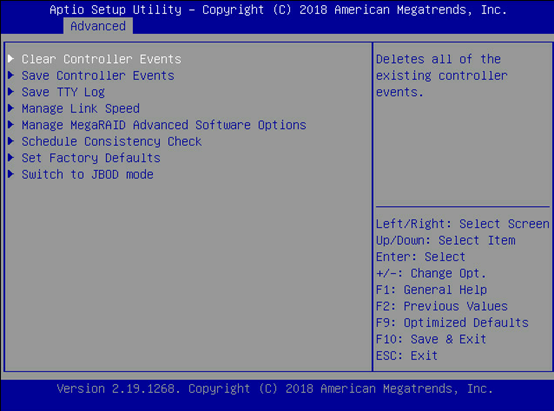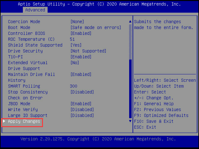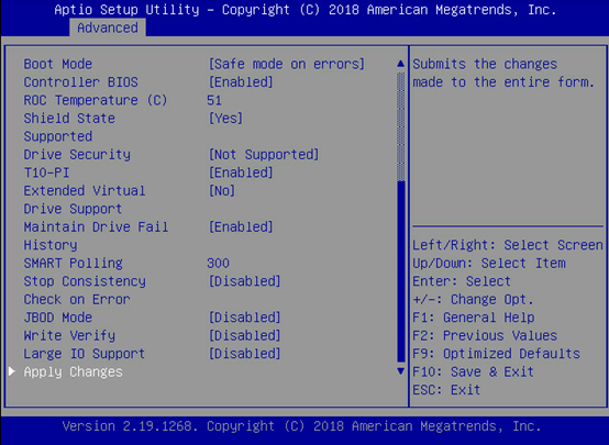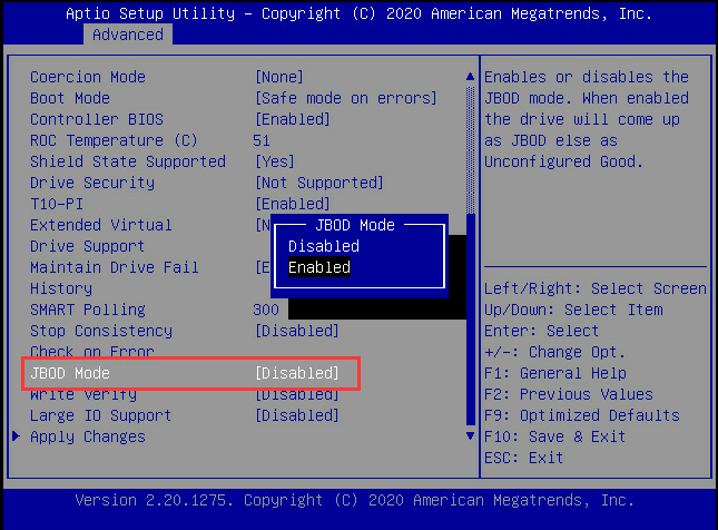 RAID模式下打开jbod功能的方法:进入“main menu” —>“controller management”—>“advanced controller properties” — >enable “JBOD mode”—>“apply changes”