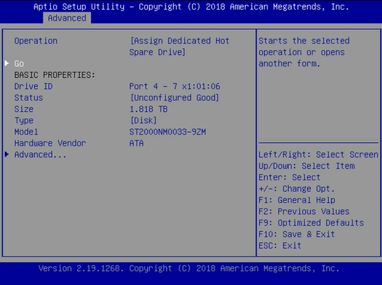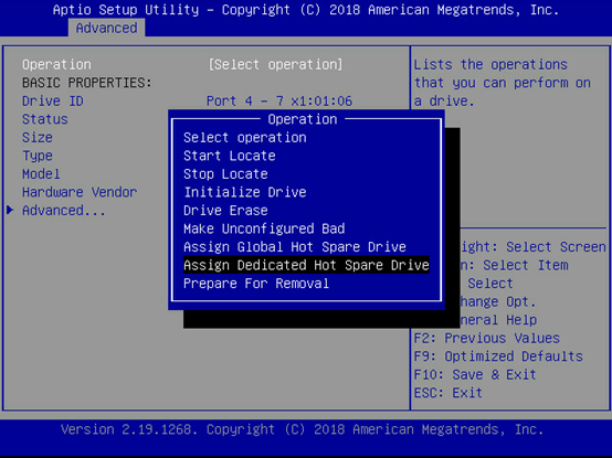 进入到硬盘操作界面Operation选项后,选择”Assign Dedicated Hot Spare Drive”,如下图: