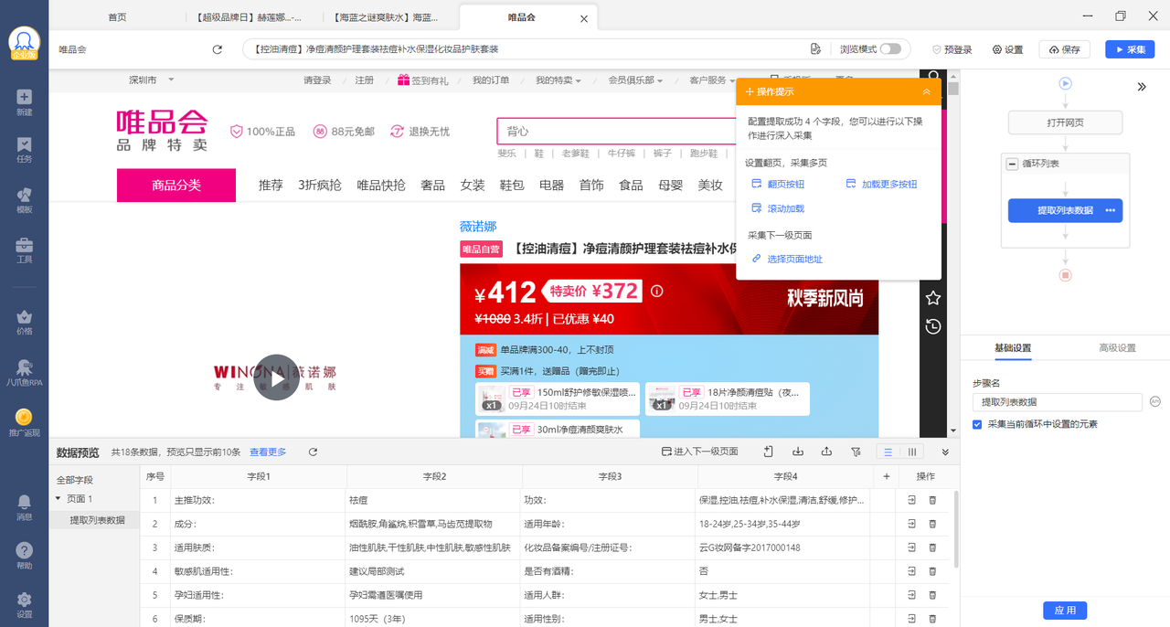 我们以几个较大的电商网站如淘宝、京东、唯品会,制作规则采集这些网站化妆品的品牌、规格、价格、颜色、产地等等信息。我们需要全面的信息维度来实现不同网站的信息匹配,这些数据必不可少。