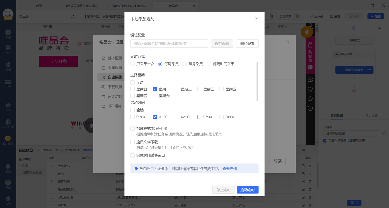 价格是波动性较强的维度,所以我们需要在八爪鱼上设置定时采集,每周实时更新这些商品信息导入系统。