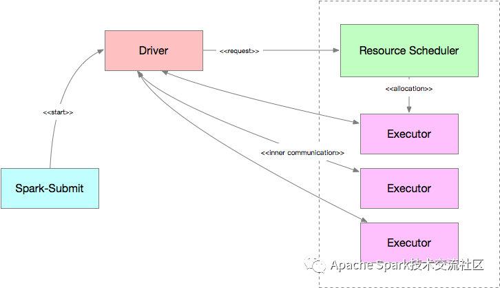 Apache Spark的运行时框架如下图所示, 其与各类资源调度器的交互流程比较类似.