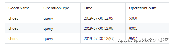 通过GoodsName、OperationType聚合一分钟内的请求次数。这里要用到Spark Streaming的滚动窗口函数,取window.start作为聚合后的时间。