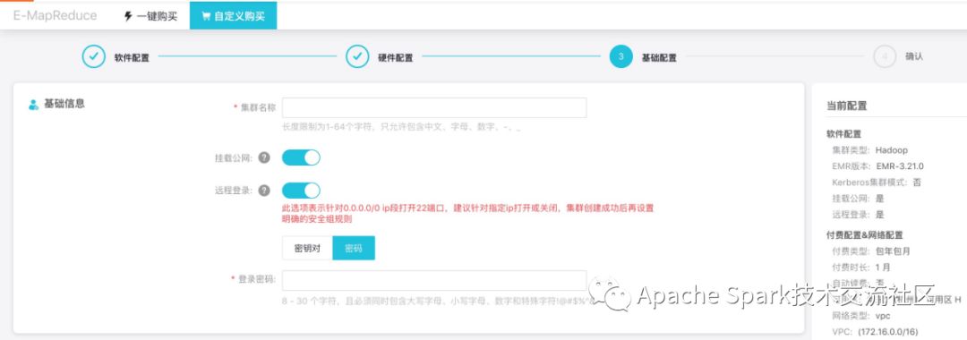 EMR暂时还不支持在官网控制台上配置写入Tablestore的任务,需要登录到MER集群的机器上去操作,所以开通EMR集群的时候,请选择自定义购买,并在最后一步打开挂载公网、远程登录、密码方式登录,自己设置一个密码,如下图。