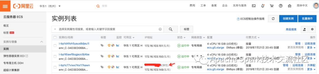 开通完以后,进入到ECS控制台,会看到有一台Master节点机器有弹性IP。后面步骤中,操作EMR Spark Streaming需要使用这个IP地址远程登录到机器上。