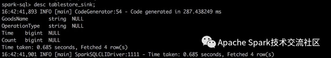 以上sql代码,创建了一个表名为tablestore_sink的表,实例名是sparkStreaming。注意:Endpoint请使用vpc域名。