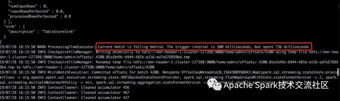 trigger.intervalMs代表批次间隔,单位毫秒,默认为0L。运行任务的时候,当间隔时间比一次任务的运行时间短的时候,任务会打印WARN日志。一般这个值的大小如果能够使得Streaming作业刚好处理好上一个的批处理的数据,那么这个就是最优值。