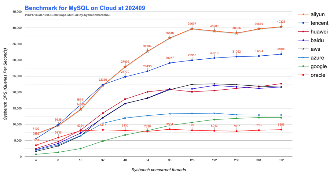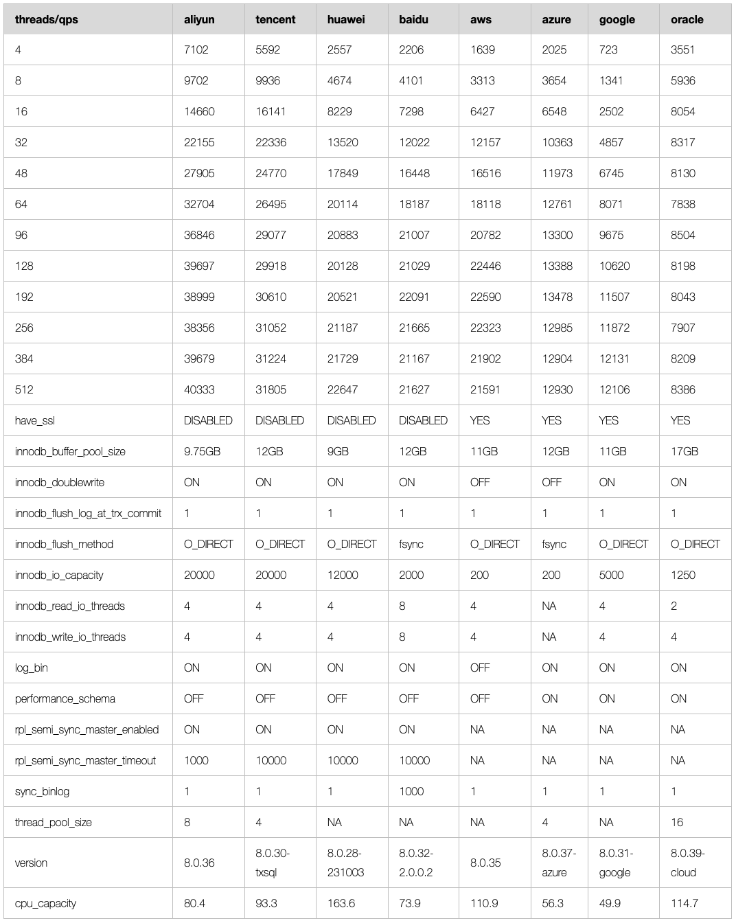 在本次测试中:阿里云RDS MySQL性能表现最好,极限的QPS达到了4万;其次是腾讯云,达到了3.2万;第二梯队是华为云、百度云和AWS,极限的QPS约2.2万;之后是Azure、Google云,极限QPS约1.2万;最后是Oracle云,极限QPS约8500。详细的数据和趋势图,可以参考以上的图、表,这里不再详述。