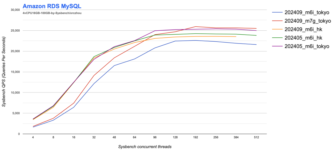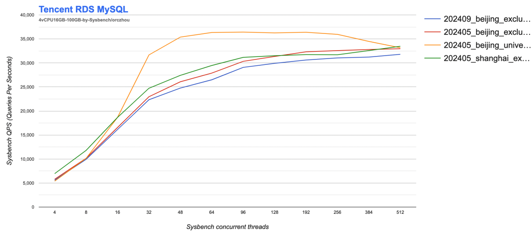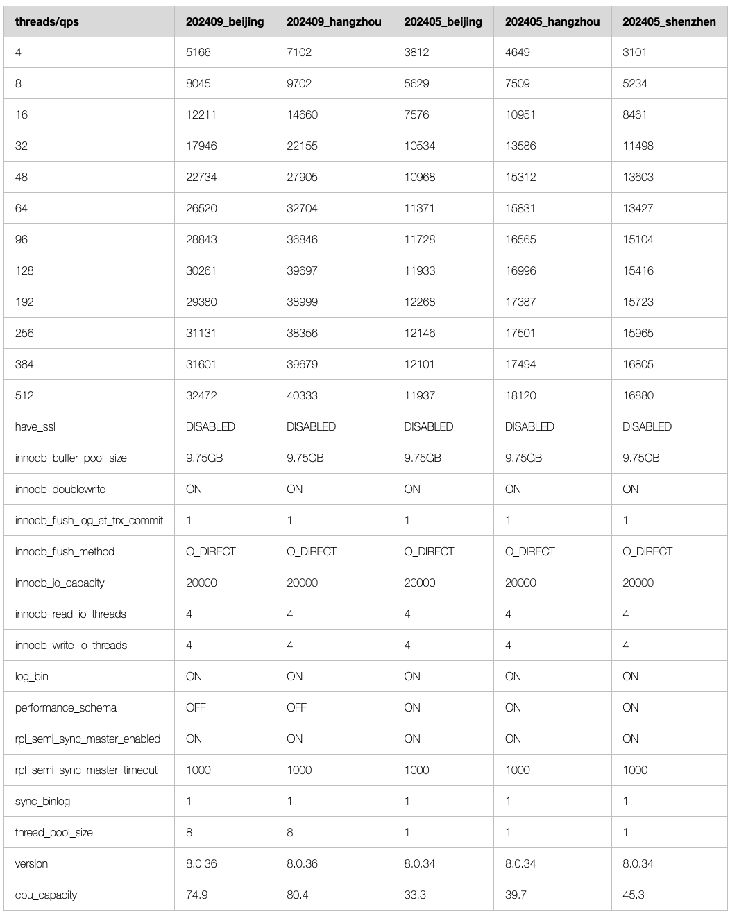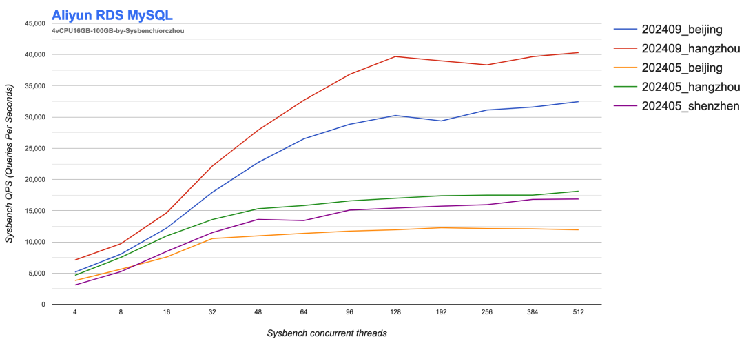本次测试了杭州、北京两个地区RDS MySQL,两个地区的实例性能相差比较明显:4万 vs 3.2万。并且,本次测试性能相比于之前的测试,性能增长明显。从这里的观察来看: