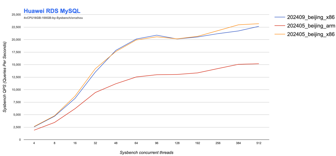 本次测试华为云表现稳定,与之前的测试表现非常接近:性能数据接近,版本几乎相同(build号从“8.0.28-231002”升为了“8.0.28-231003”),所提供的CPU计算能力也几乎相同。注意到,华为云RDS MySQL一直是所有云厂商,所提供的计算能力最高的厂商。似乎,是这样,别的云厂商的的4c16g通常是,4个超线程,而华为云似乎真的是提供了4个核(cores)。