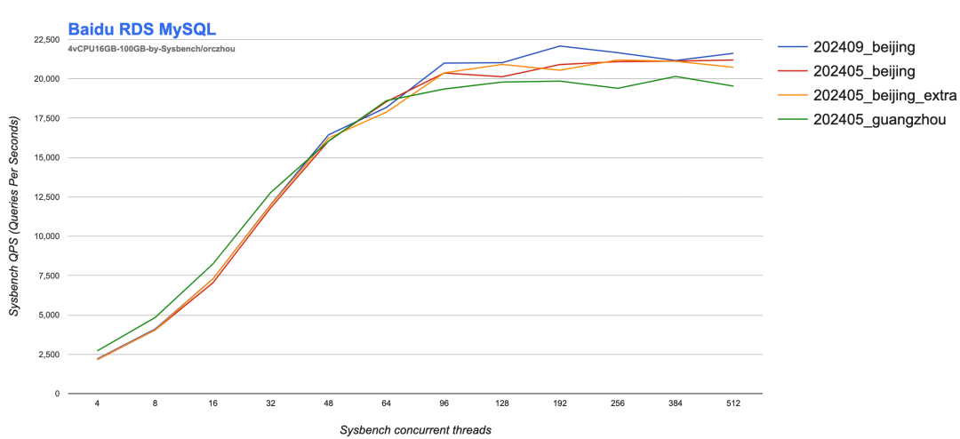 百度云RDS提供非常稳定的性能。如下图数据所示,四次测试,整体的性能表现非常稳定,地域差异也比较小。