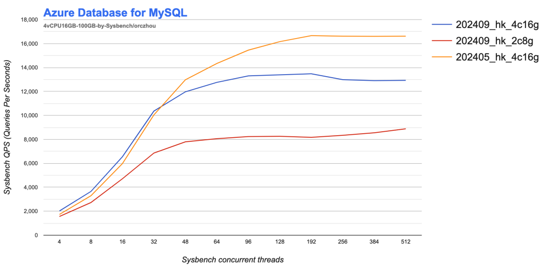 Azure的实例有着很多厂商类似的CPU代差导致的性能波动问题,在202409的测试中CPU计算能力指标为56.3,相比202405表现的63.9,也下降了12%,Azure Database for MySQL的Sysbench QPS性能也随之下降。