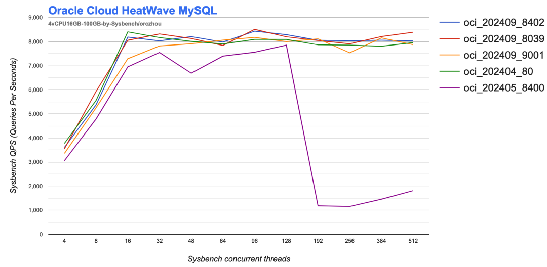 可以看到,整个上各个版本在该测试模型下表现较为一致。仅8.4.0(也就是8.4的第一个版本)在超高并发下,性能有明显退化,而该问题也在最新的8.4.2修复了。