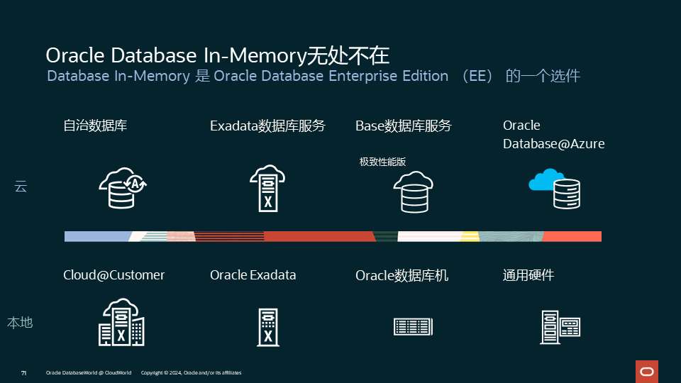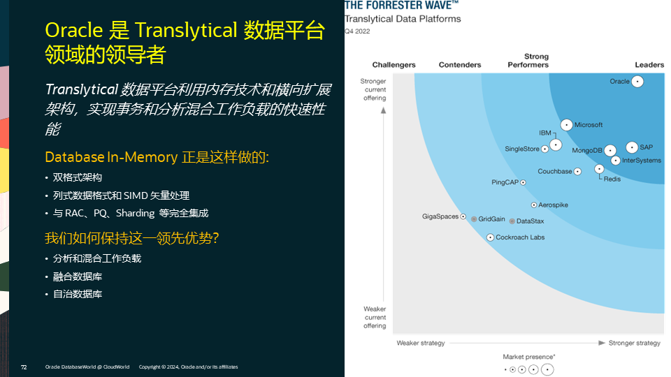 Database In-Memory非常适合于混合事务/分析处理架构,即HTAP架构。HTAP也称为Translytical,Oracle在这一领域有很深的技术积累和很强的技术优势,详见之前文章:Oracle数据库的HTAP能力。除了Database In-Memory,在Oracle内存计算家族中,还包括其他非常重要的成员,包括TimesTen,Exadata,以及23ai中的True Cache,对应于只读缓存,可写缓存,独立数据库,闪存缓存,一致性缓存等丰富的内存计算应用场景,关于在何种情况下应采用哪种内存计算技术,可参见之前公众号的文章:Oracle内存计算应用模式。