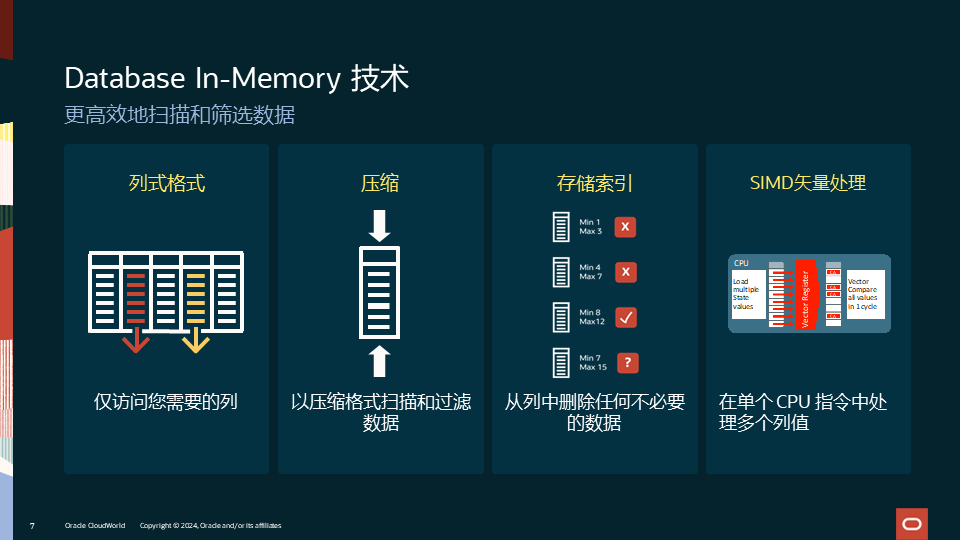 本文分为“温故”和“知新”两部分,第一部分我们将简单回顾Database In-Memory的四大技术创新。然后我们将重点介绍23ai中的Database In-Memory新特性。关于Database In-Memory的详细技术介绍,可参考之前的文章:加速度:走进Oracle Database In-Memory。关于其技术要点和优势,可参考文章:不选择Database In-Memory的10大理由。