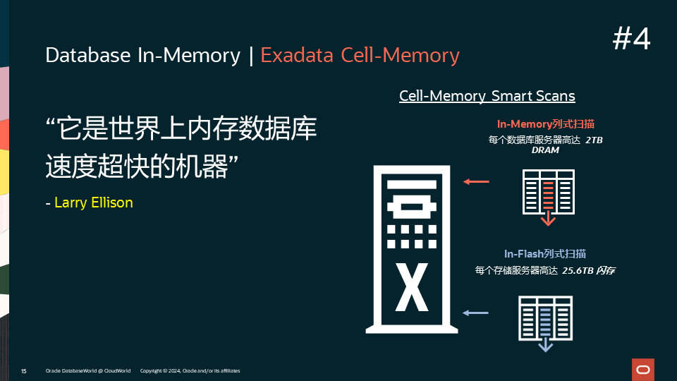 第4项创新是Database In-Memory技术与Exadata的结合。Database In-Memory可将其列式技术延伸到Exadata上的大容量闪存,从而使更多的,更大的数据库对象可以享受Database In-Memory的好处。并且,Database In-Memory的一些高级特性只在Exadata上提供支持,如内存复制技术,这可以在保证性能的同时提供更高的可用性。